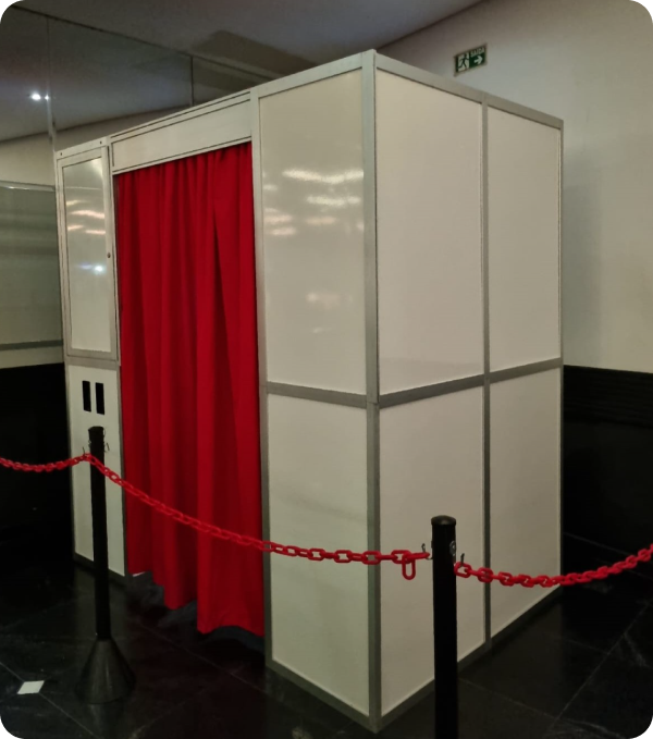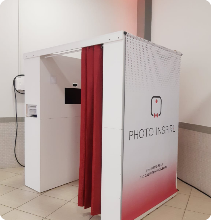 Nossa clássica cabine chama a atenção em qualquer evento. Garante privacidade e diversão na medida certa, a capacidade dela é para até 5 pessoas por sessão. Estrutura em mdf branco para não interferir na decoração do evento. Por dentro ela tem cortina vermelha.