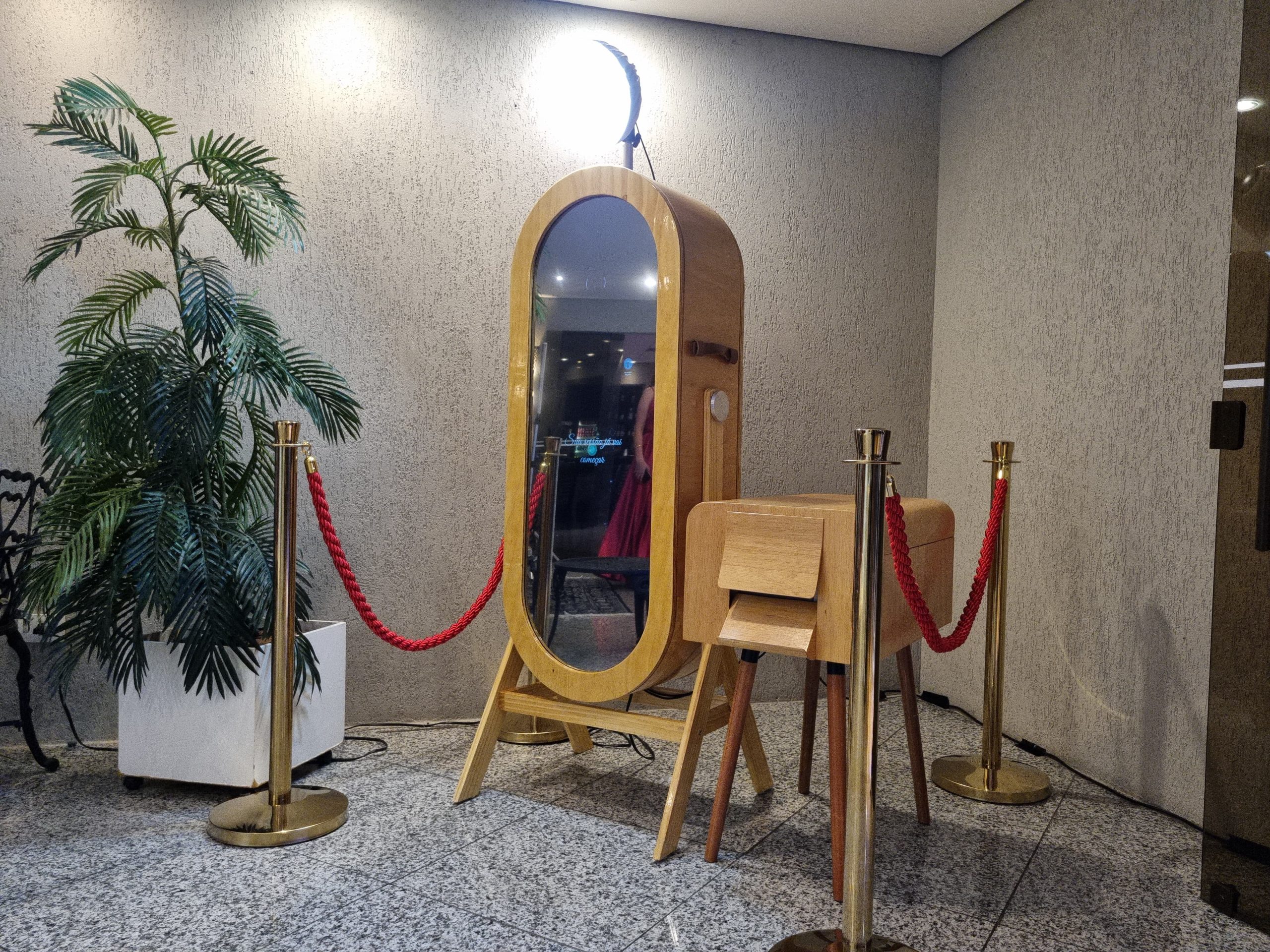 Nosso Espelho Mágico Vintage enquadra, em média, 6 pessoas por sessão. Compacto, elegante e exclusivo, ele é perfeito para deixar seu evento ainda mais especial, adicionando um toque final de charme e sofisticação à decoração. Com seu visual refinado harmoniza com diversos estilos de festas, encantando seus convidados e garantindo fotos incríveis.